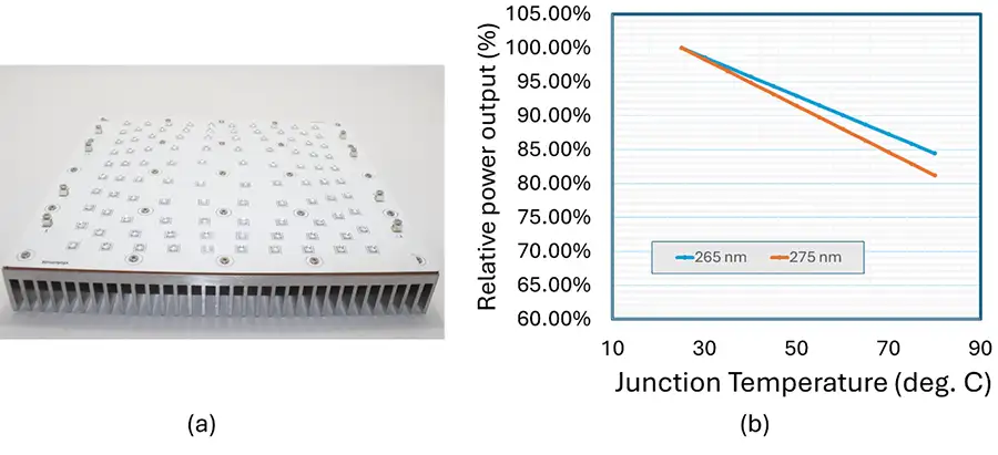 Figure 4: (a) Example of a UV LED array on a heatsink (b) Degradation in optical power with an increase in junction temperature for 265 and 275 nm LEDs