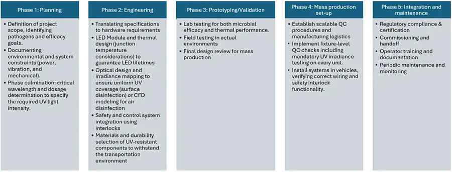 Design Considerations: Ensuring electrical and mechanical compatibility is critical to minimizing installation barriers. For HVAC applications, this includes utilizing standard duct-mount brackets and compatible power interfaces. For lighting applications, integration of UV modules alongside standard LED white-light fixtures should be prioritized to streamline deployment. Control systems should be compatible with existing fleet management software and may be implemented via a driver console or a concealed control module, supporting both scheduled and trigger-based operation. Fail-safe operation (“fail as OFF”) should be incorporated to protect users. Optimal thermal management must be integrated within the mechanical constraints to maintain LED performance and longevity.