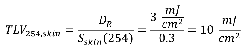 Similarly, the TLV for skin damage at 254 nm (TLV254,skin) can be calculated by dividing the reference dose at λ = 270 nm by the relative spectral effectiveness for skin damage at λ = 254 nm: