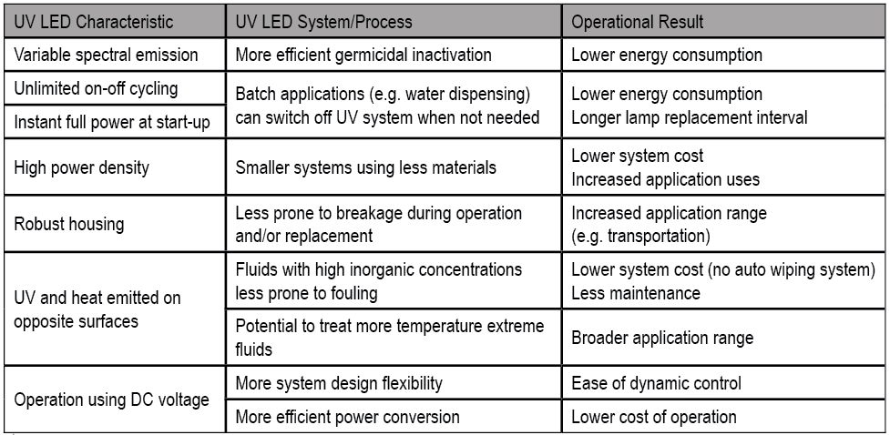 The commercialization of UV-C LEDs has permanently changed the UV industry landscape. The market for small point-of-use UV systems has expanded as manufacturers of beverage dispensers, ice machines, medical devices, grey-water recycling systems, RVs and etc. have realized the operational flexibility gains. Bluetech Research recently labeled decentralized UV LED as a ‘unicorn’ in the water treatment space, and UV Safe, an industry trade group, estimates that over 2 million such systems now are installed. Table 1 highlights characteristics, advantages and operational benefits of UV-C LEDs that are influencing this changing landscape.