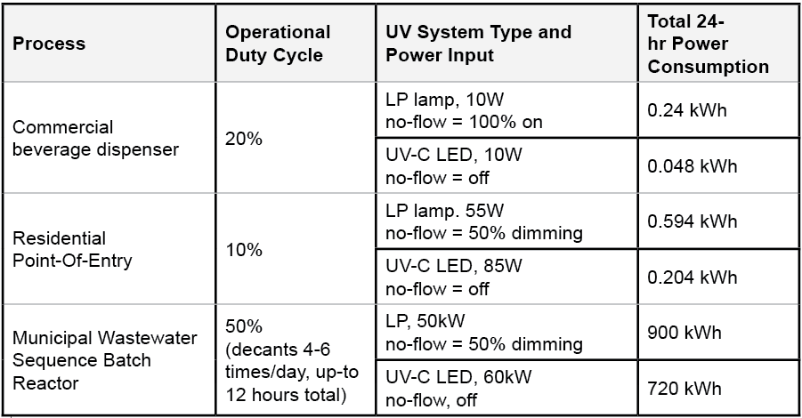 The fact that UV-C LED disinfection systems may be operated in a fundamentally different mode to both LP- and MP-based lamp disinfection systems is a notable prospect for water treatment process designers and operators. Mercury vapor lamps degrade on power cycling and can have relatively long warm-up times; therefore, manufacturers provide usage warranty restrictions and continuous operation is common (with dimming). The result is a system that is operational 24/7, drawing power and degrading lamp output even where the treatment process does not require continuous operation. It’s easy to imagine various batch processes that operate in such a way (see Table 2).