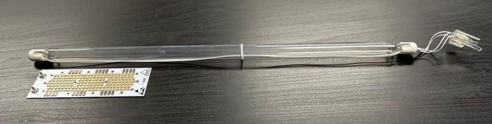 Figure 3: Example of a commercially available Gas Discharge Mercury Lamp with 12 W UV-C optical output and UV-C LED lamp array with 25 W UV-C optical output