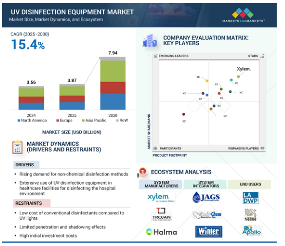 • UV Disinfection Equipment Market: Projected to reach USD 3.87 billion in 2025, growing at a CAGR of 15.4% to USD 7.94 billion by 2030. This is fueled by rising concerns about waterborne and airborne diseases, the need for chemical-free disinfection and the increasing use in healthcare settings. See Figure 1.